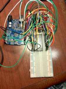 So the basic deal is that D2 to D9 on the Arduino connect to D0 to D7 of the flash ROM, but they’re also used as the 8 inputs to the two LS374’s so that we can latch a low address (A0 to A7 of the flash ROM), and a high address (A8 to A15) of the flash ROM. The other higher address lines of the flash ROM come from the Arduino’s A1 to A3. There’s just a few other pins connected directly from the Arduino.